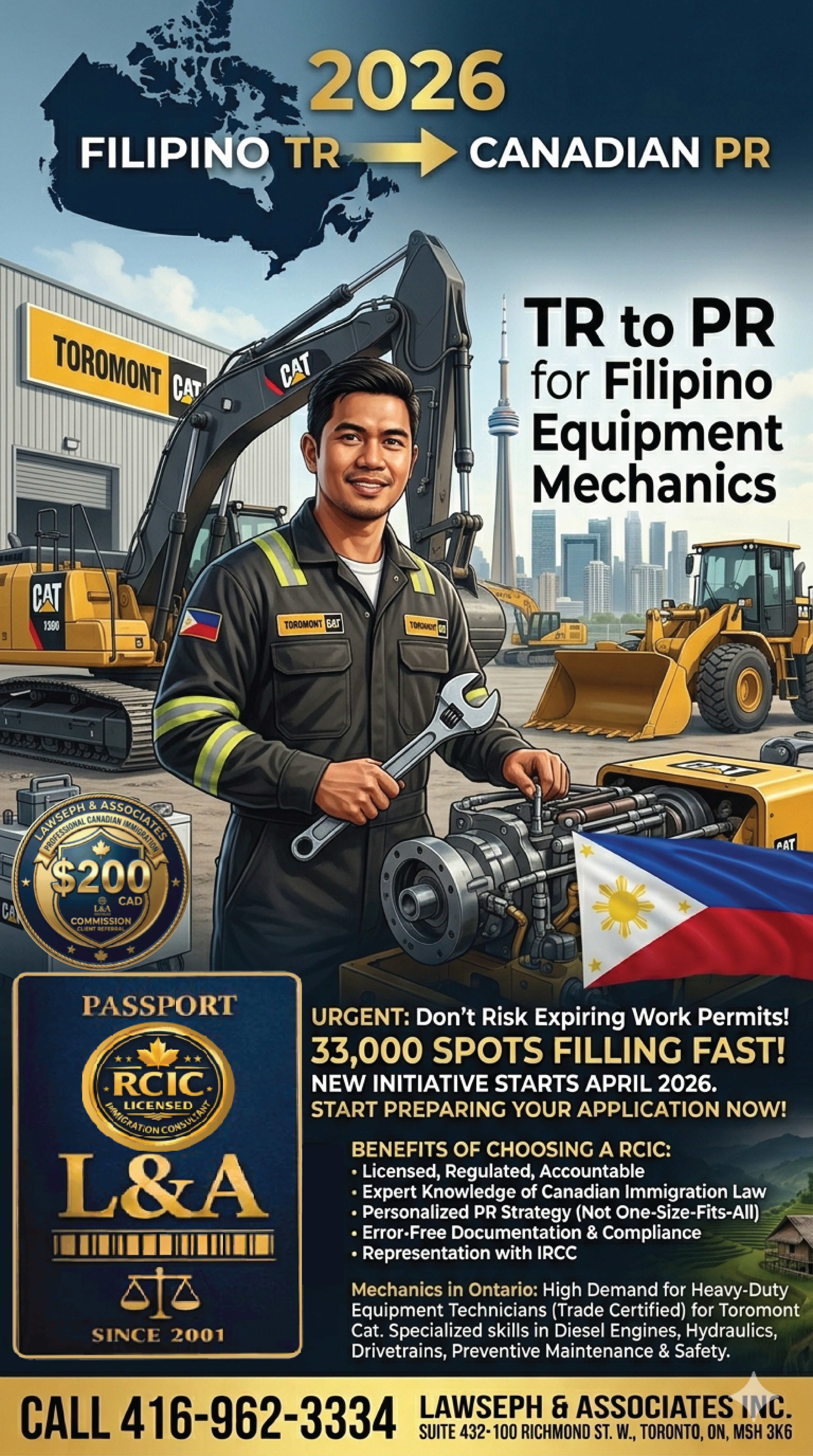 Permanent Residence (PR) for Filipino Heavy equipment mechanics working in transportation for Toromont Cat in Toronto in April 2026.